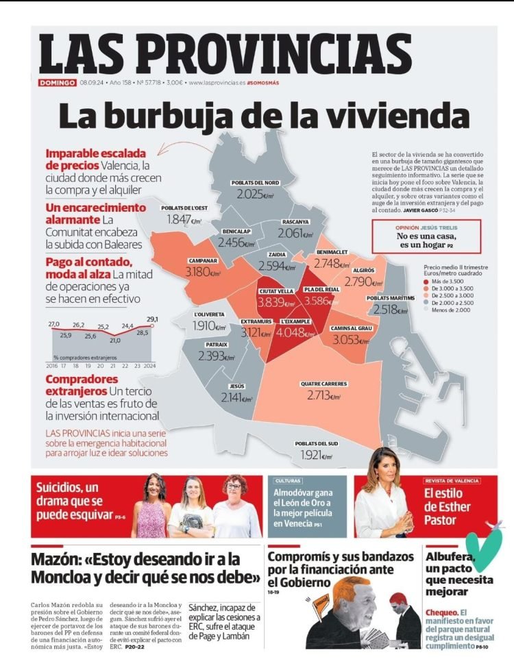 Het belangrijkste dat ons bijna altijd tegen houdt is de prijs. Wie Had dat gedacht? We gaan een paar voorbeelden gebruiken. Dit hoeft natuurlijk niet te betekenen dat deze makelaars altijd belachelijk dure huizen hebben zonder kwaliteitscontrole. Deze woning is absoluut belachelijk duur. De rechtvaardiging van de prijs is dat het opnieuw is ontworpen door een bekende Valenciaanse architect. Eerlijk gezegd kan ons dat niet zoveel schelen. Het is nog steeds meer dan 6500 euro per m2 in een gebied met een gemiddelde prijs van 3121 euro per m2. In hetzelfde gebied staat binnenkort een veel betere woning te koop voor 300k minder en een enorm terras. De duurste koopwoning in Valencia kost maar liefst 12000 per m2. Las Provincias van deze week heeft het over de gemiddelde prijzen in elk gebied van Valencia, je kunt de afbeelding hieronder zien, en het duurste gebied, L’Eixample of Ensanche is iets meer dan 4000 euro per m2. 12.000 euro per m2 is absoluut idioot. Maar het spreekwoordelijke toppunt is deze absolute roofprijs van iets meer dan 17000 euro per m2 op het Plaza del Ayuntamiento. Wat deze belachelijke prijzen natuurlijk doen, is de gemiddelde prijzen die je hieronder ziet kunstmatig opdrijven, want niemand betaalt dat voor deze plekken. Ze zullen waarschijnlijk voor altijd te koop staan of op een dag van de site gehaald worden en voor een veel lagere prijs opnieuw aangeboden worden.