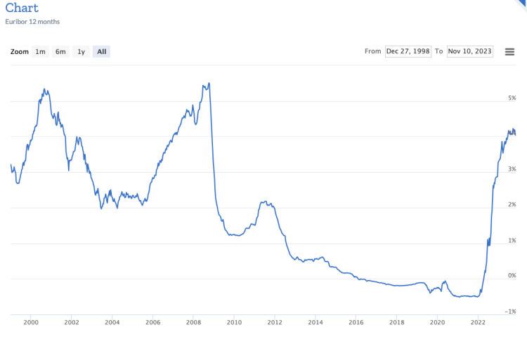 In de bovenstaande grafiek kunnen we het historische Euribor-tarief zien en het lijkt alsof de stijging de afgelopen twee jaar enorm is geweest. Dat is ook zo, maar het was hoger vóór de financiële crisis van 2008. Ook als we uitzoomen naar het afgelopen jaar zien we iets anders.