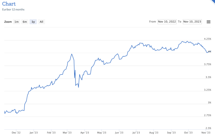 Sinds juli van dit jaar, zie hieronder, zijn de stijgingen van Euribor afgezwakt en sinds eind september is er een dalende trend. De voorspellingen zijn dat Euribor in 2024 verder zal dalen met tarieven van rond de 3% tegen het einde van het jaar.