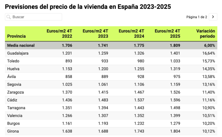 De verwachtingen voor de markt in Valencia voor de komende twee jaar zijn een prijsstijging van iets minder dan 10% omdat de vraag hoog blijft. Dit is niet de hoogste stijging in Spanje, die behoort toe aan Guadalajara, maar het ligt wel boven het nationale gemiddelde van ongeveer 6% in deze periode. De grafiek hieronder was van eind vorig jaar, maar het is bewezen dat hij tot nu toe klopt, met het voorbehoud dat de prijsstijgingen in het jaar tot eind 2023 eigenlijk hoger zijn geweest.