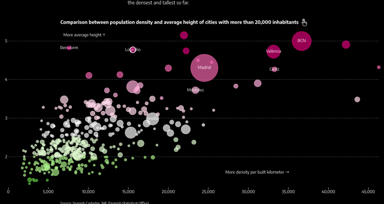 65% van de mensen in Spanje woont in een appartement, wereldwijd alleen na Zuid-Korea, waar 74% in een flat woont. Ter vergelijking: in de EU woont gemiddeld 41%, in de VS 21% en in het Verenigd Koninkrijk slechts 15%. De reden hiervoor is de manier waarop de stedelijke ontwikkeling in Spanje is verlopen en om te begrijpen waarom er vorige week een fascinerend artikel verscheen in El Diario. Je kunt het hier in het Engels lezen en het is echt fascinerend en niet te vergeten een uitstekende manier om gegevens te illustreren.