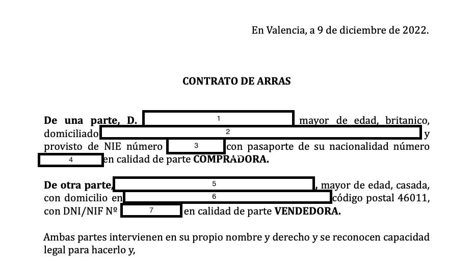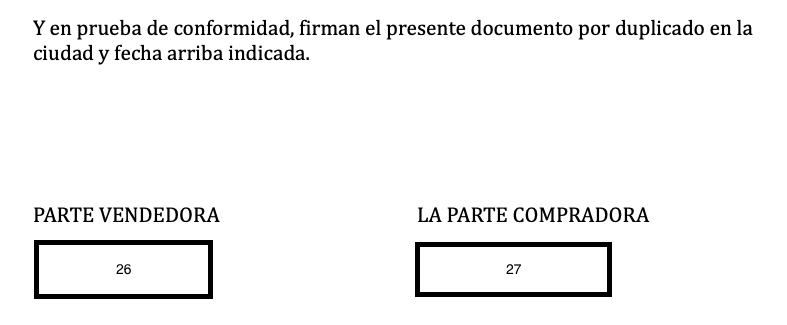 De verkoper wordt dan geïdentificeerd (5) met zijn burgerlijke staat en adres (6) en zijn DNI/NIE-nummer (7). Er wordt vermeld dat ze er allebei mee instemmen dat de ander het recht heeft om dit contract te ondertekenen en dat ze het wettelijke recht hebben om dit te doen.