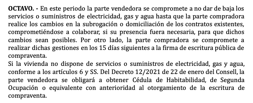 De achtste clausule gaat over het overzetten van elektriciteit, water en gas. De verkoper verklaart dat hij de diensten niet zal afsluiten totdat de koper de tijd heeft gehad om de huidige contracten over te dragen of nieuwe contracten in werking te stellen en hij verklaart dat hij zal helpen bij het overzet proces als dat nodig is (dit is soms belangrijk voor waterbedrijven). De koper verplicht zich om de nutsvoorzieningen binnen 15 dagen na ondertekening van de koopakte op zijn naam te zetten.