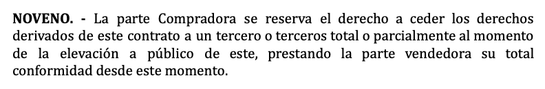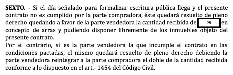 De zesde clausule is het belangrijkste deel over waarom dit type contract beide partijen beschermt. Als de koper op de laatste dag niet koopt, verliest hij zijn aanbetaling en wordt het contract ongeldig, waarbij de verkoper het betaalde geld houdt (25). Maar als het tegenovergestelde waar is en de verkoper zijn kant van het contract niet nakomt, door niet op te komen dagen of zich te bedenken, dan moet hij het dubbele van de aanbetaling teruggeven aan de koper, zoals bepaald in artikel 1454 van het burgerlijk wetboek in Spanje.