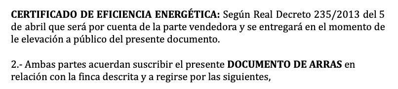 In het volgende deel staat dat de verkoper volgens de eisen van de wet bij aankoop een energiecertificaat zal overleggen. Tot slot komen beide partijen overeen dat dit een aanbetalingscontract met arras is en dat de volgende clausules hierop van toepassing zijn.