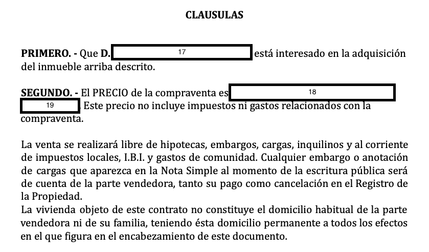 De eerste clausule is dat de opnieuw geïdentificeerde koper geïnteresseerd is in het kopen van het hierboven beschreven huis. De tweede clausule stelt de prijs (18) vast die door beide partijen is overeengekomen en (19) is de munteenheid die bijna altijd euro is (soms kunnen tussen een koper en verkoper uit een ander land andere munteenheden worden gebruikt, maar bijna nooit). Er staat dat deze prijs exclusief kosten of belastingen is.