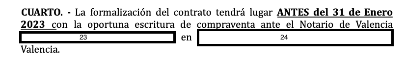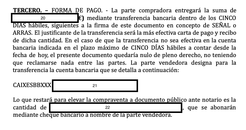 De derde paragraaf gaat over de betalingswijze. Bij het ondertekenen van dit document betaalt de koper een aanbetaling (20), meestal rond de 10% die ter plaatse wordt betaald of, zoals in dit geval, binnen vijf werkdagen wordt betaald via een bankoverschrijving naar de bank van de verkoper (21) in dit geval Caixa Bank. We vragen meestal om een kopie van de overschrijving binnen de periode van vijf dagen als bewijs van betaling, omdat het geld misschien niet meteen op de bank van de verkoper staat. Als het geld niet binnen die vijf werkdagen is overgemaakt, dan is deze overeenkomst nietig. In het laatste lid staat dat de rest van de overeengekomen prijs (22) op de dag van aankoop bij de notaris per cheque op naam van de verkoper zal worden betaald.