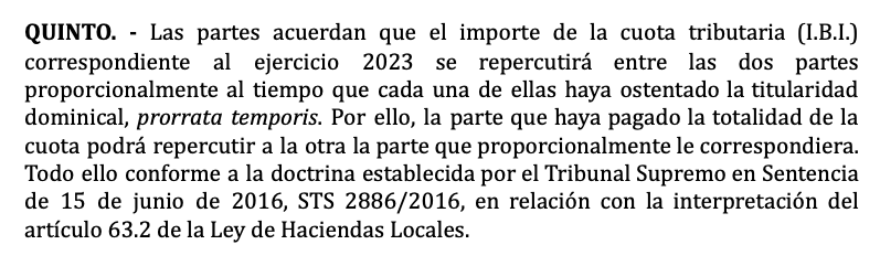 De vijfde clausule is nieuw in de afgelopen jaren. Hierin staat dat de gemeentebelasting voor het jaar naar rato door beide partijen wordt betaald op basis van de datum van ondertekening. Dit ondanks het feit dat de gemeentebelasting voor dit jaar op naam van de verkoper komt. De ene partij zal de andere op een afgesproken manier compenseren voor de betaling. Meestal betekent dit dat de koper de verkoper contant wat geld betaalt en dat de rekening door de verkoper bij aankomst op zijn naam wordt betaald voor het lopende jaar. Wij geven de voorkeur aan het tegenovergestelde, waarbij de verkoper onze koper betaalt en wij de verkoper vragen om ons de rekening te sturen als die binnenkomt. (Voor het geval ze niet betalen door de automatische incasso van tevoren te annuleren).