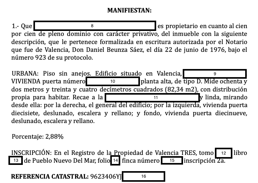 Vervolgens wordt het huis beschreven met het adres (9), de verdieping in dit geval omdat het een appartement is (10), de grootte en de verdeling. Het vertelt je waar het huis ligt ten opzichte van andere straten en buren (11) en het percentage van het eigendomsrecht dat overeenkomt met het appartement (omdat bijna alle verkopen eigendomsrecht zijn). Vervolgens wordt de inschrijving in het eigendomsregister vermeld, in dit geval het Valencia register en nummer, volume (12), boek (13) in welk gebied, pagina (14) gebouwnummer (15) en welk opschrift. Het eindigt met het identificeren van het eigendom met het Catastrale nummer dat begint met 7 cijfers, dan YJ en eindigt met meer cijfers en letters.