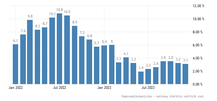 Je kunt de historische prijsgegevens voor Valencia hier bekijken. Alles is het afgelopen jaar gedaald ten opzichte van 2022, behalve melk, eieren, sigaretten en rundvlees, maar toch waren de inflatiecijfers voor de afgelopen twee jaar als volgt in de grafiek hieronder. De prijzen stegen nog steeds, maar met een veel lager niveau dan in 2022, we zitten momenteel rond de 3% inflatie. Dit zijn geannualiseerde cijfers, dus de 10,8% is niet per maand voor Argentijnen die meekijken, het is over de afgelopen 12 maanden, niet over 12 dagen. Je kunt hier duidelijk het effect zien van problemen in de toeleveringsketen en de oorlog in Oekraïne op de energieprijzen.