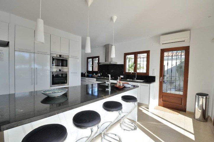 De eerste verdieping heeft een luxe master suite met een kleedruimte, en-suite badkamer en toegang tot het balkon. Een tweede tweepersoonsslaapkamer en een ruime badkamer maken het niveau compleet, samen met een zithoek in galeriestijl die leidt naar een balkon met uitzicht op de sinaasappelboomgaarden. Beide slaapkamers komen uit op een groot terras op het zuiden, opnieuw met prachtig uitzicht op zee en de bergen.